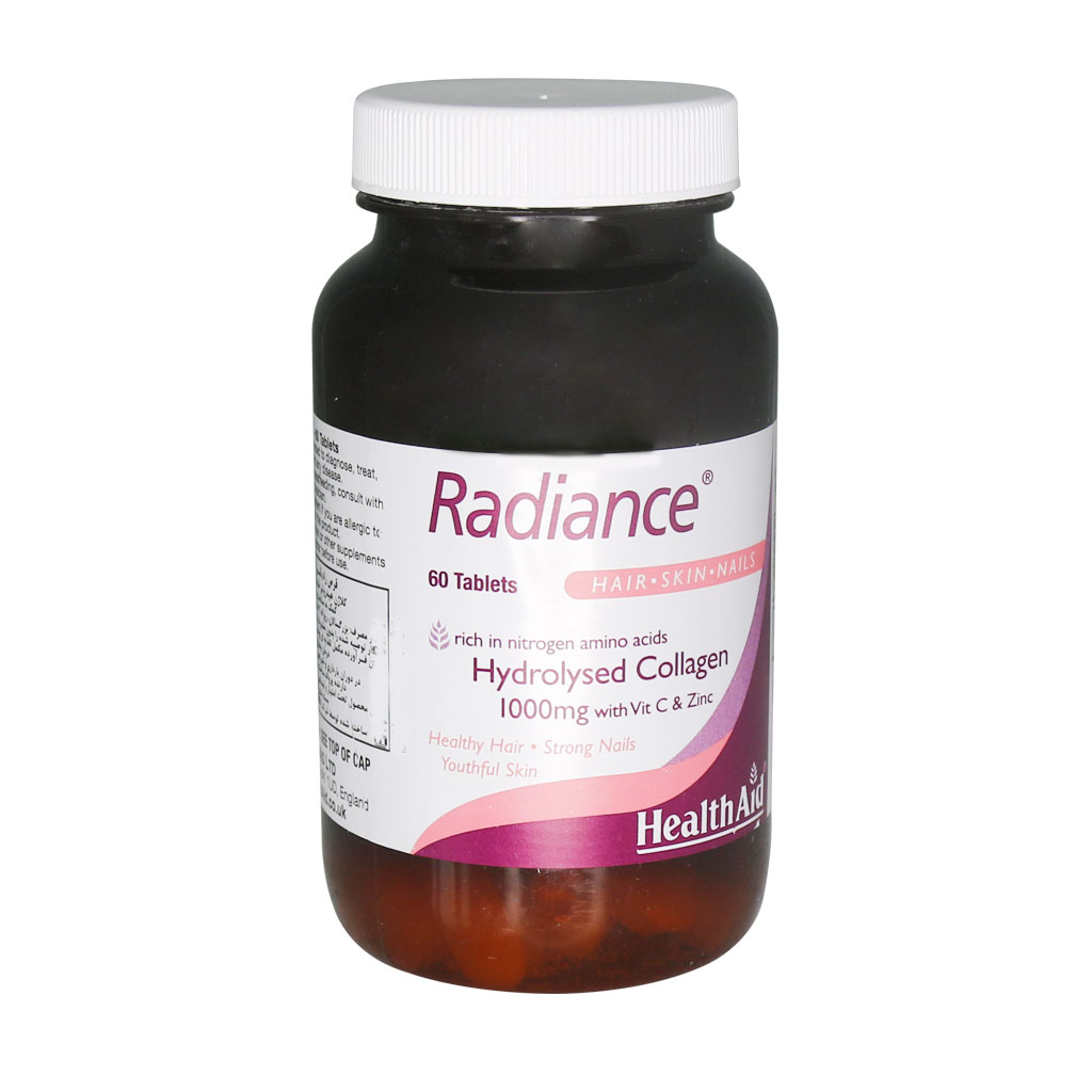 قرص رادیانس هلث اید تحت امتیاز و لیسانس شرکت هلث اید انگلستان تولید شده است. این محصول با داشتن کلاژن هیدرولیز شده، ویتامین C و روی یک مکمل ایده آل جهت سلامت پوست، مو و ناخن به شمار می‌آید. مصرف این قرص میزان کلاژن را در بدن افزایش داده و به همین دلیل است که بعد از استفاده پوست تان درخشان تر می‌شود.